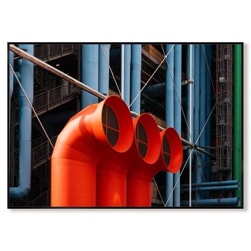 Cette photographie de Bruno Aressi met en lumière un détail architectural du Centre Pompidou, icône de l’architecture urbaine contemporaine.