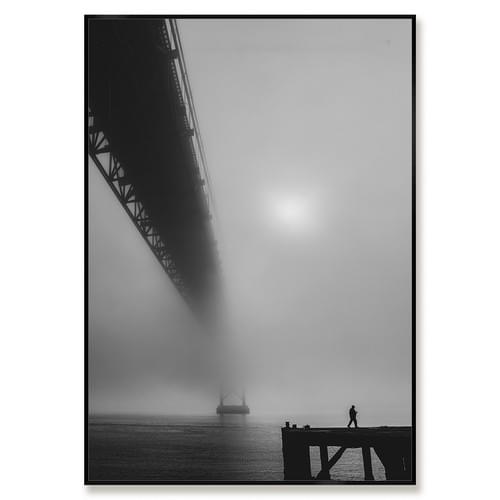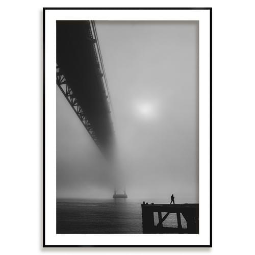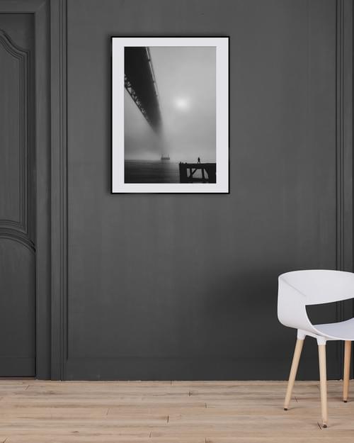 Cette photographie en noir et blanc du pont du 25 Avril à Lisbonne signée Bruno Aressi se distingue par une composition graphique et minimaliste. Les lignes métalliques émergent de la brume, créant une image moderne et intemporelle où architecture et atmosphère se rencontrent.