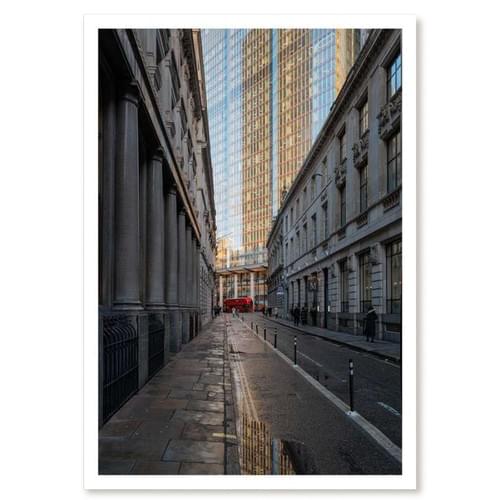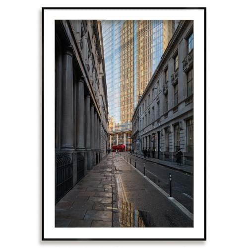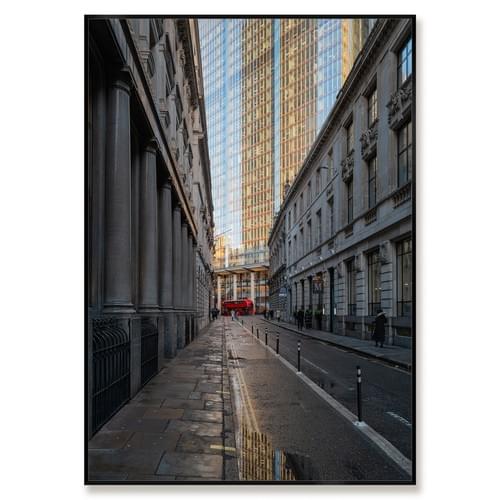 Cette composition graphique, met en évidence le choc architectural entre histoire et modernité. Au cœur de cette géométrie urbaine maîtrisée, un élément iconique de la capitale britannique attire immédiatement l’attention en apportant une touche de couleur vive et dynamique.