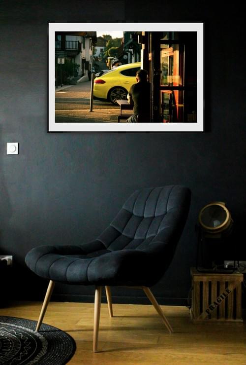 Entre immobilité et mouvement, cette photographie contemporaine joue sur les contrastes chromatiques et les reflets pour créer une composition moderne et percutante.
